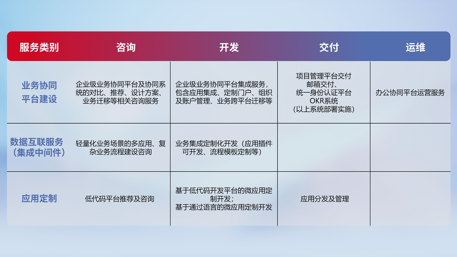 针对钉钉、、企微、、IDaas等平台级产品提供产品的规划、、、、方案、、交付、、定制化开发等服务,,,实现如统一协同办公、、、、智能客户服务、、、、混合会议管理、、、、智能数据查询、、、等业务场景,,实现数字化转型。。。。